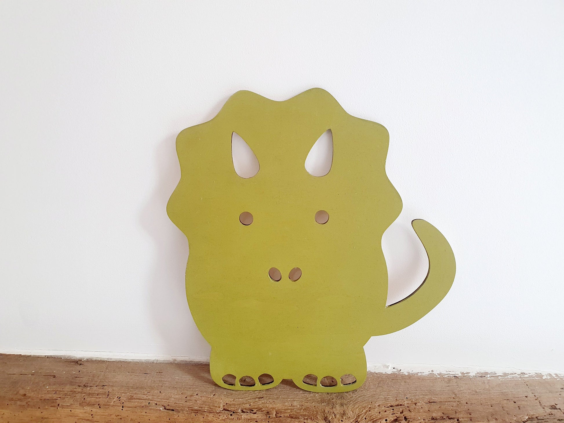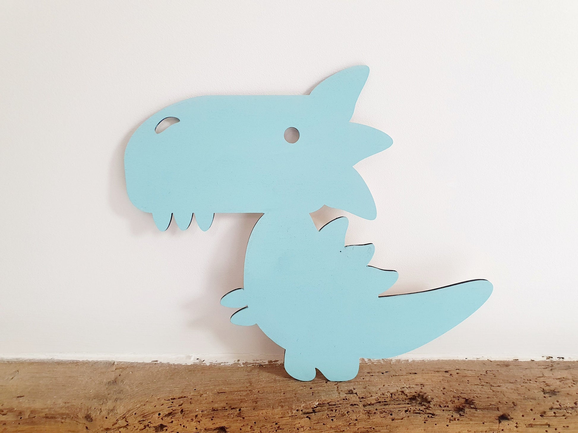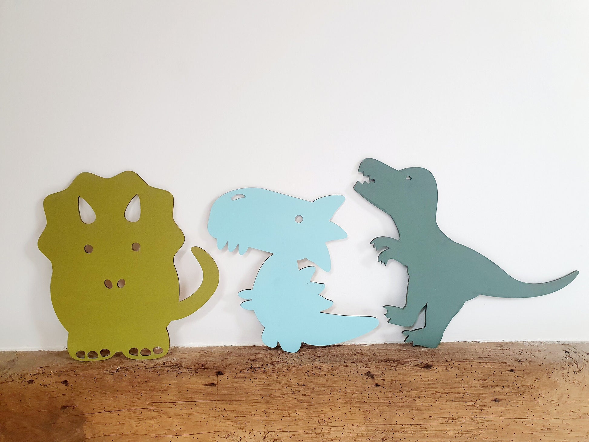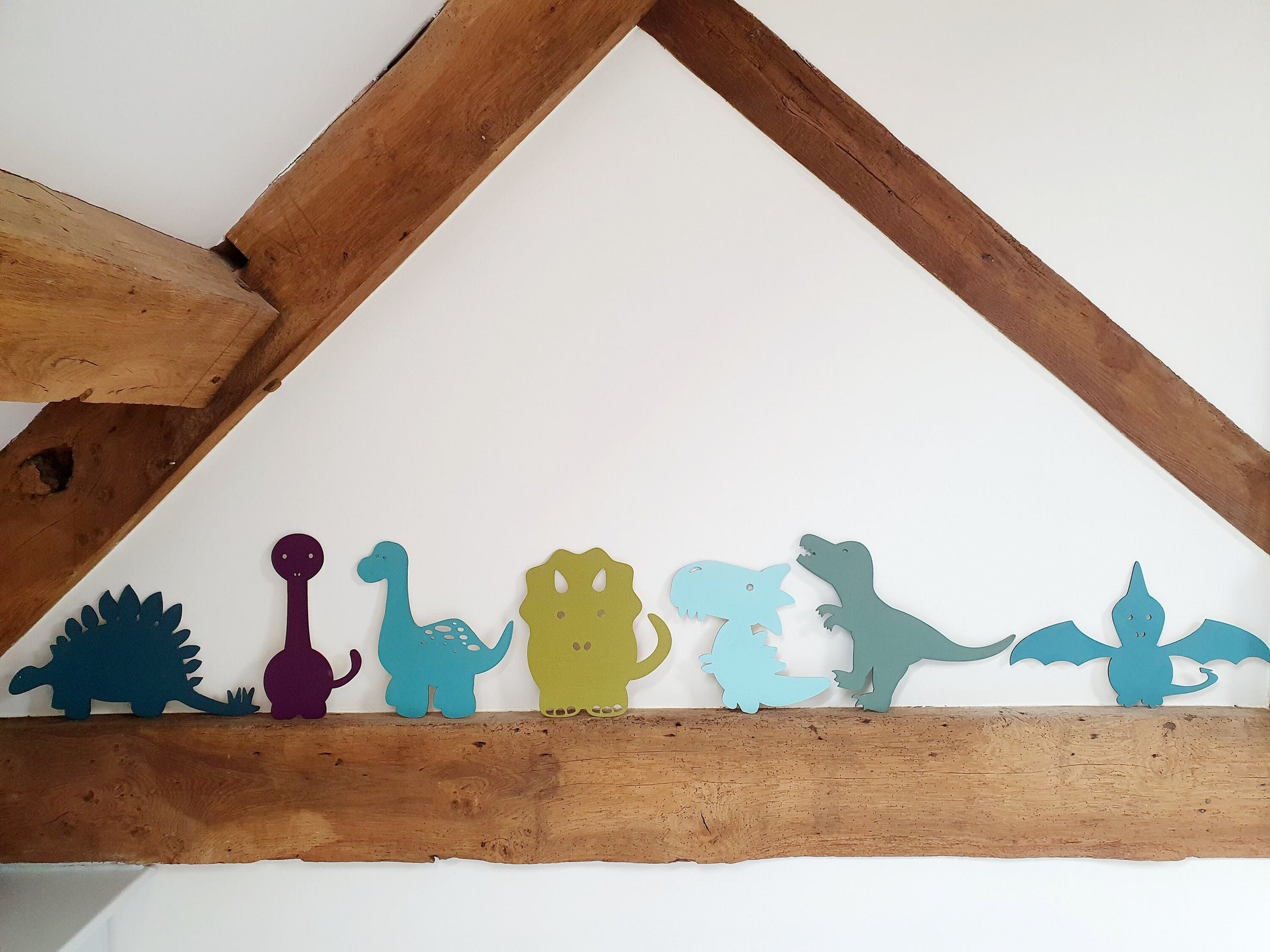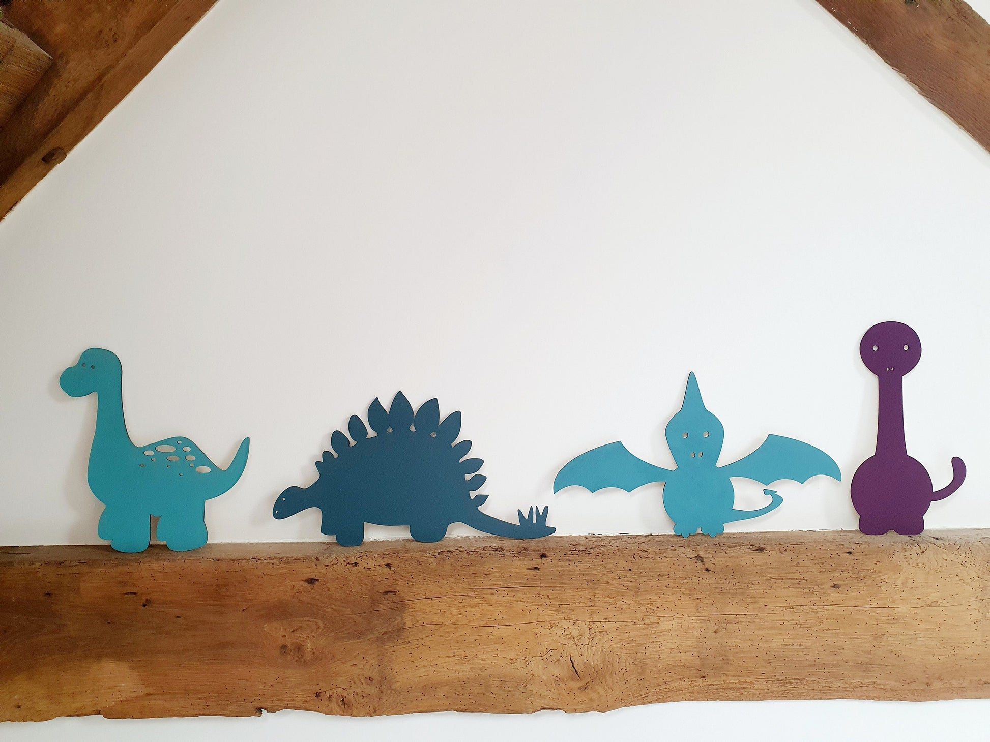 Roarrrrrrr! Our wooden dinosaur family make a lovely addition to any home. The dinosaur wall hangings have been carefully designed and crafted by Cherry Lane Interiors and are hand painted in a range of colours. The dinosaurs are approx 20cm but if you would like them bigger or smaller get in touch. You pick the dinosaurs and colours you would like. The wooden dinosaurs are made from birchwood and are 4mm thick. The dinosaurs look lovely on the wall and come with a sticky back foam to place on your walls or alternatively they look fabulous added to a shelf or ledge like shown in the pictures. The dinosaurs include a tyrannosaurus, pterodactyl, styracosaurus, brontosaurus, pachycephalosaurus, triceratops and a diplodocus.