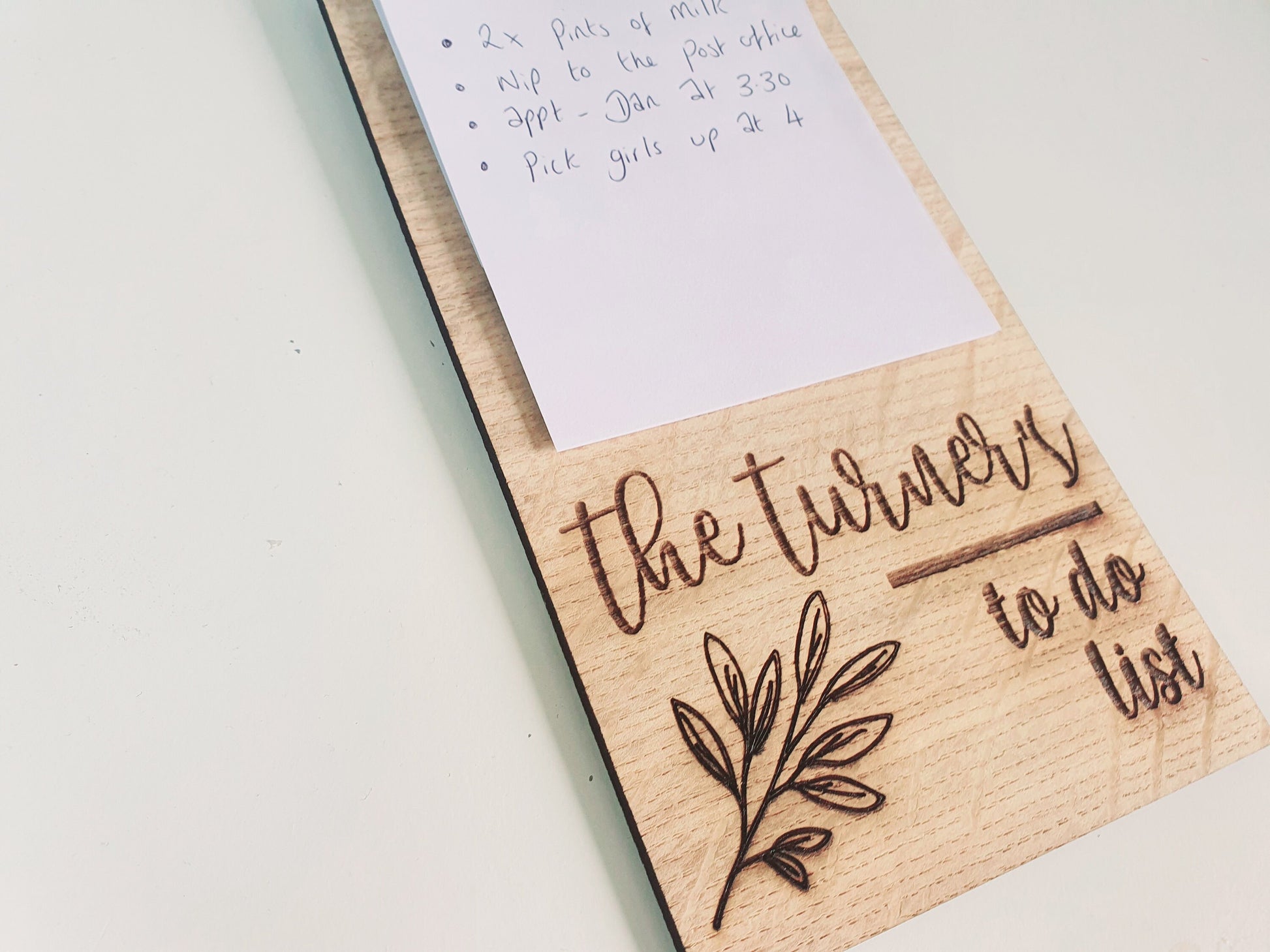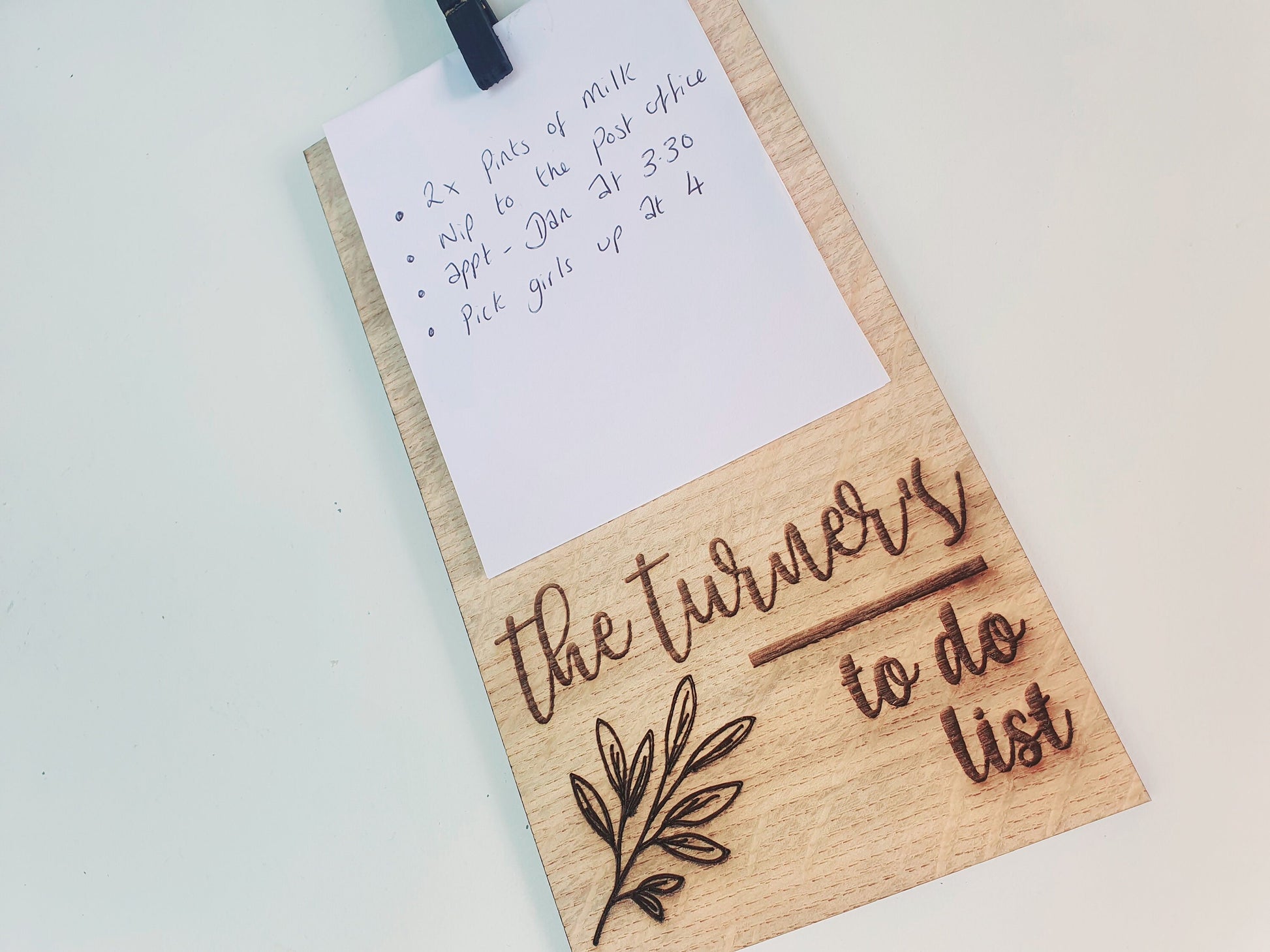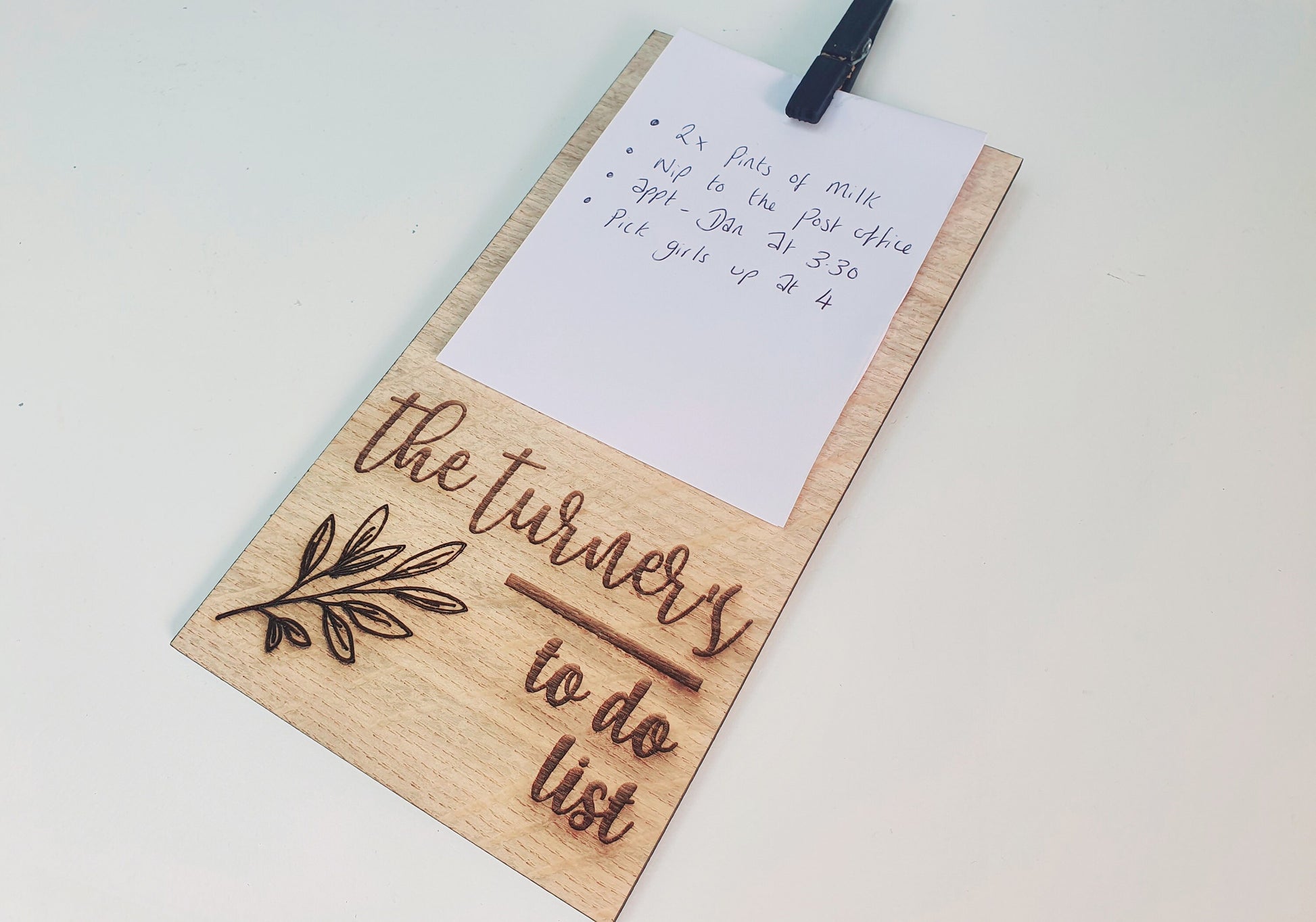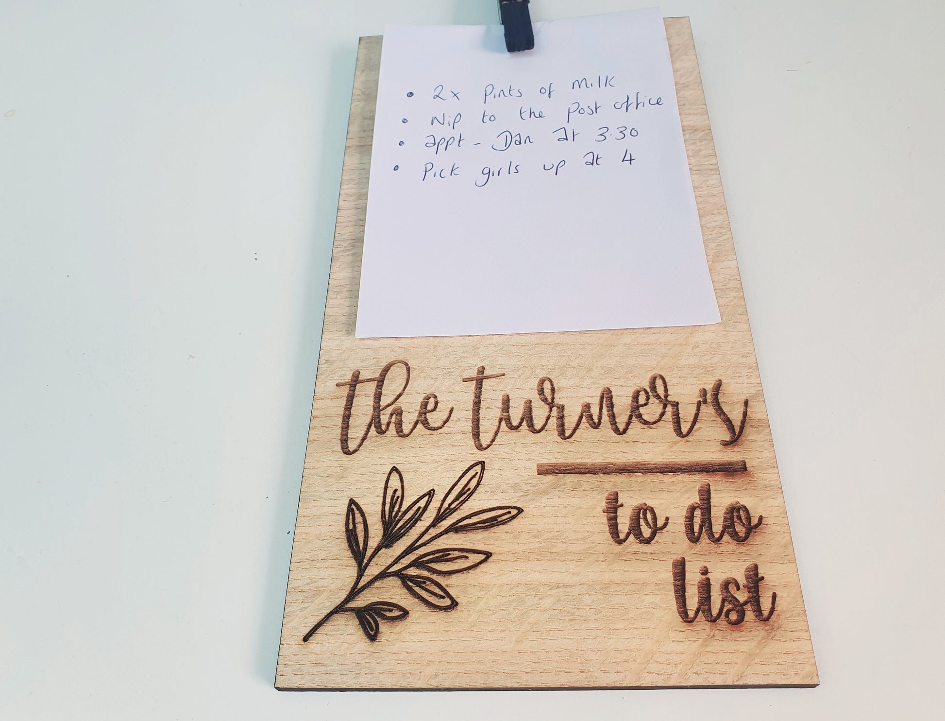 Why not treat someone special to one of our fabulous custom, any name wooden to do lists made out of oak veneered wood. The wooden any name to do list has a rustic feel and looks lovely in any home. It's a great small personalised gift to give to anyone who likes to write to do lists. The wooden to do list can include the name of your choice and if you would like to include anything else we can add this. To hold the paper on the todo list a peg is attached to the wood which is handpainted a soft black colour.