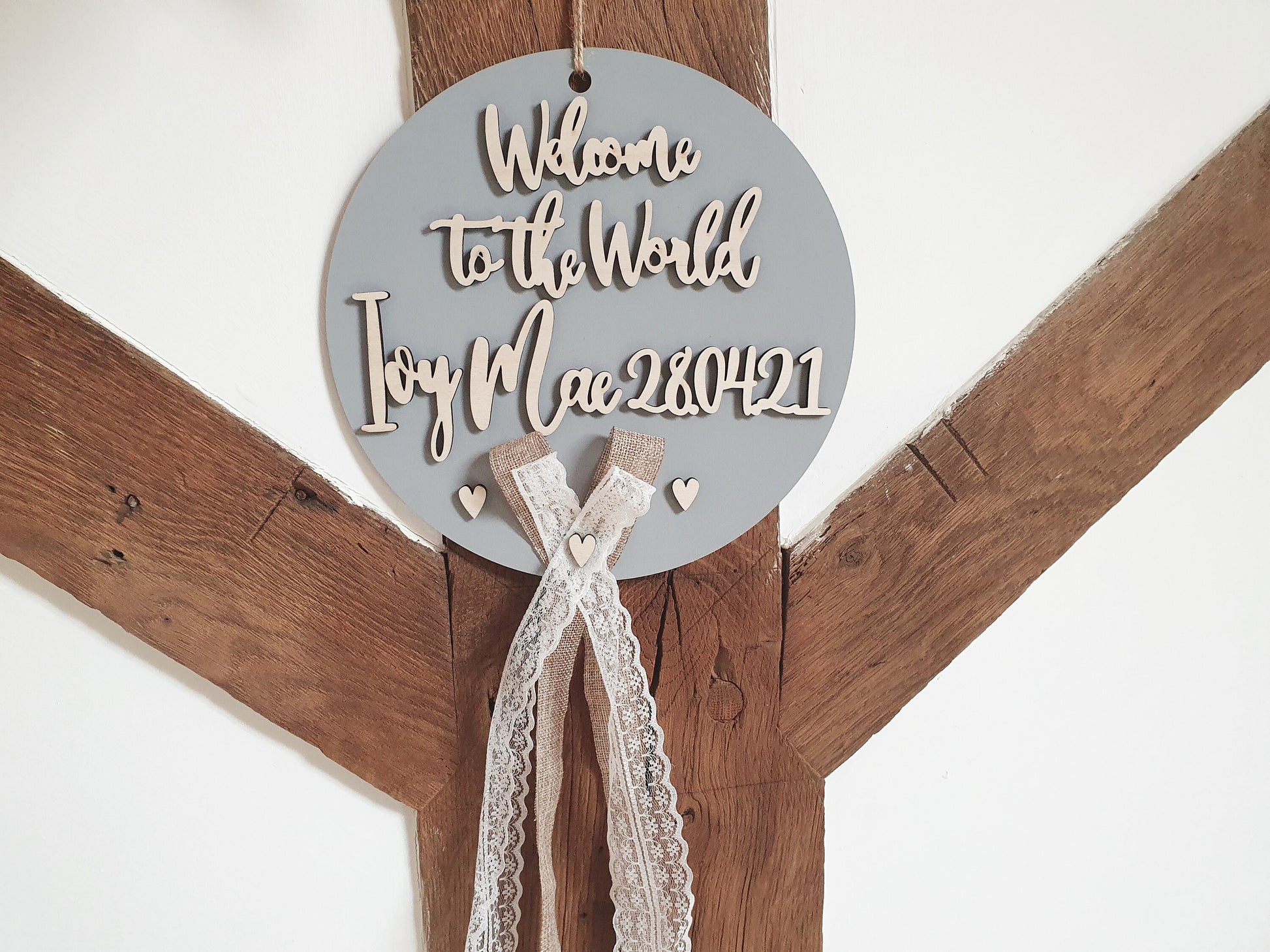 Our beautiful custom wooden 'Welcome to the World' baby sign looks lovely on any door or wall. The door hanger/wreath/sign is such a lovely gift for new parents welcoming their babies into the world. As the sign comes with the babies name and their date of birth the sign looks lovely pictured with the new arrival and could be used for the babies announcement that they're here to family and friends. The welcome to the world sign has been designed and crafted by Cherry Lane Interiors with lots of love and hugs. The sign complements any decor in a nursery.
