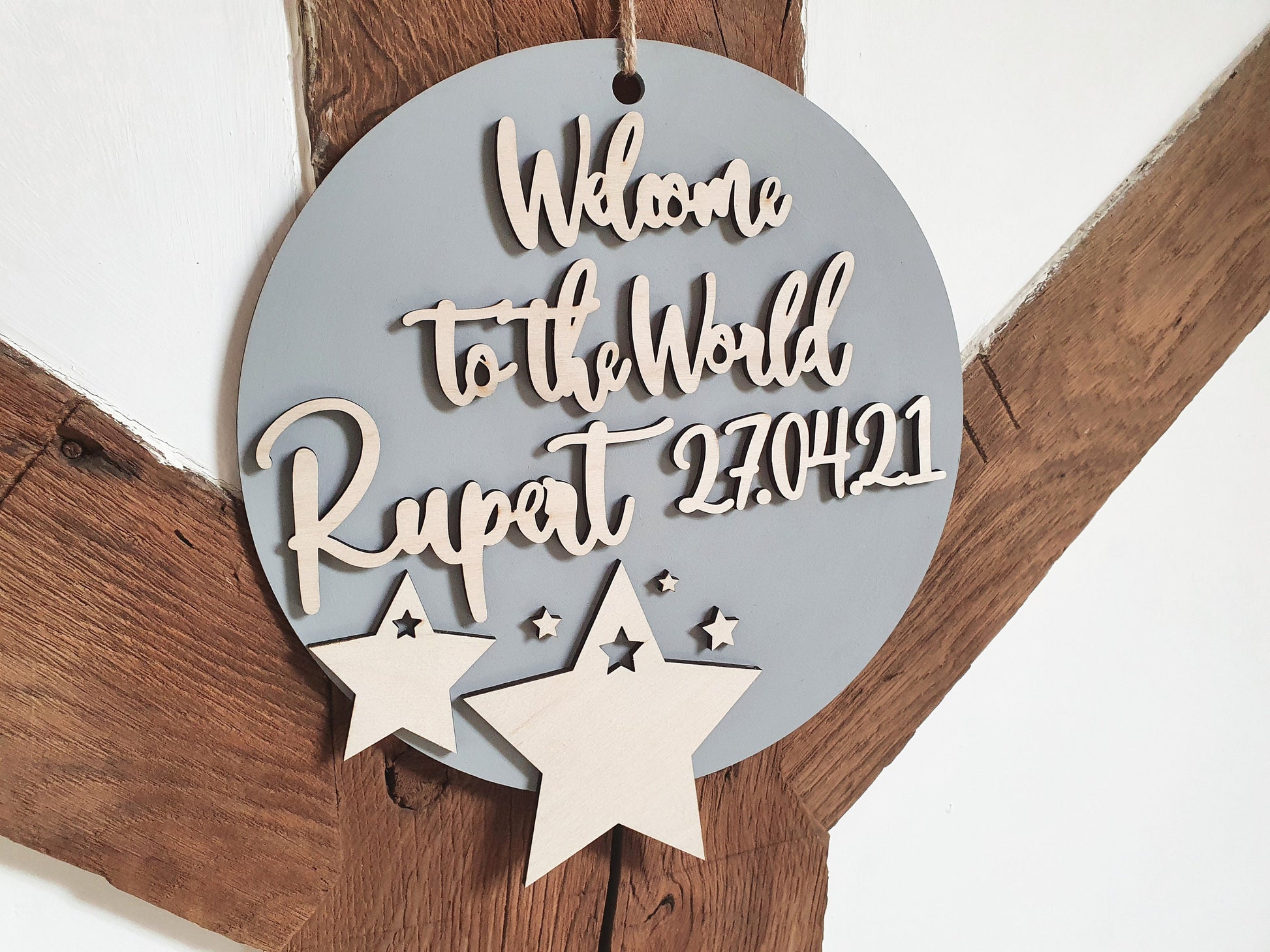 The sign is handpainted and comes in a range of colours. Pictured is our slate grey welcome to the world sign. It comes with twine to hang the sign and a rustic wooden star pattern.