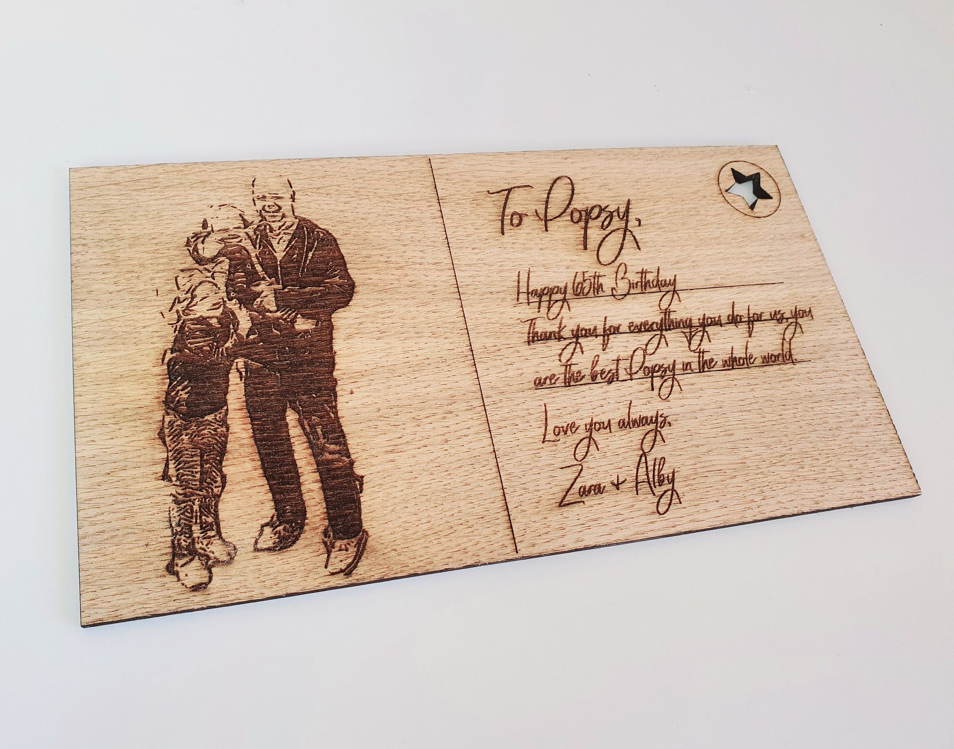 We're really excited to bring to you a fabulous rustic wooden postcard gift that includes an engraved line drawing portrait and custom text/message of your choice. You get to add a name for who the postcard is for, the message and sign the postcard off with the name/s of your choice. The line drawing is based on any photo that you send us. The postcard has a stamp with a cut out star and underlines all the text giving it a real postcard feel. The process is, once you've sent us a photo, we will take the background out of the photo and use our design software to convert your photo into a line drawing. The wooden line drawing postcard makes a lovely gift for any occasion, particularly for a birthday or Christmas. It also makes a great gift for any dad, mum, grandparent, sister, brother, auntie, uncle . The line drawing is engraved onto an oak veneered wood and is 22cm wide and 4mm deep.