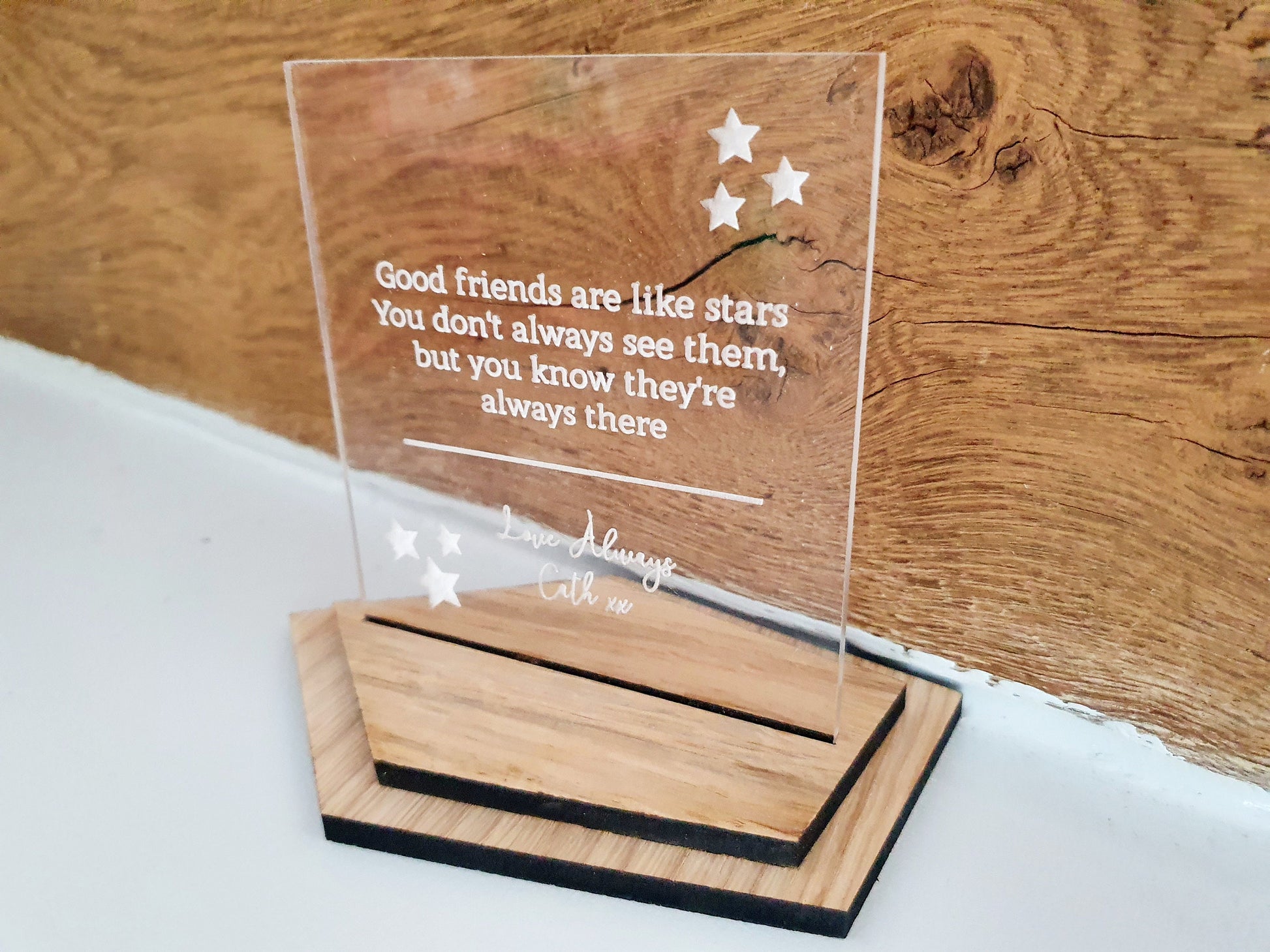 Your perfect gift for your friend awaits! The friendship quote plaque with a custom message is a lovely reminder to a friend how much you mean to them. Whether it's your friend's birthday or a special occasion or even just any old day, make them feel extra special with our plaque that includes a lovely quote and custom message of your choice. A perfect gift for any friend! A beautiful, rustic, personalised wooden and clear perspex acrylic plaque with base that includes one of our favourite friendship quotes. 'Good friend's are like star's, you don't always see them, but you know they're always there's.