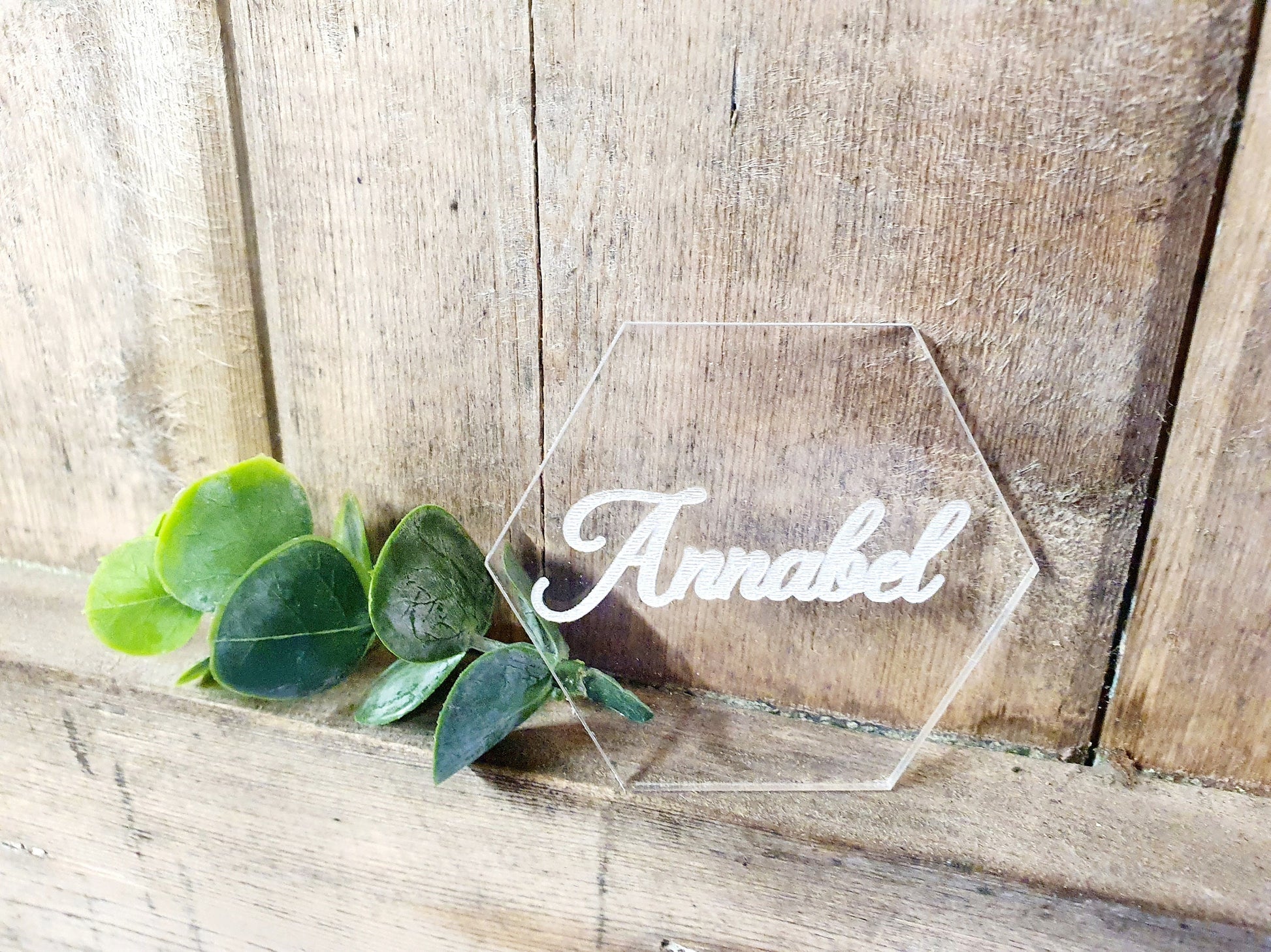 Our beautiful clear perspex acrylic engraved wedding place cards make a glamorous addition to your table places at your wedding reception. A wedding place card that your guests can keep forever and they are pretty unique to! The clear perspex acrylic engraved hexagon weddings place cards can be personalised with each of your guests names and they've been designed and crafted by Cherry Lane Interiors.
