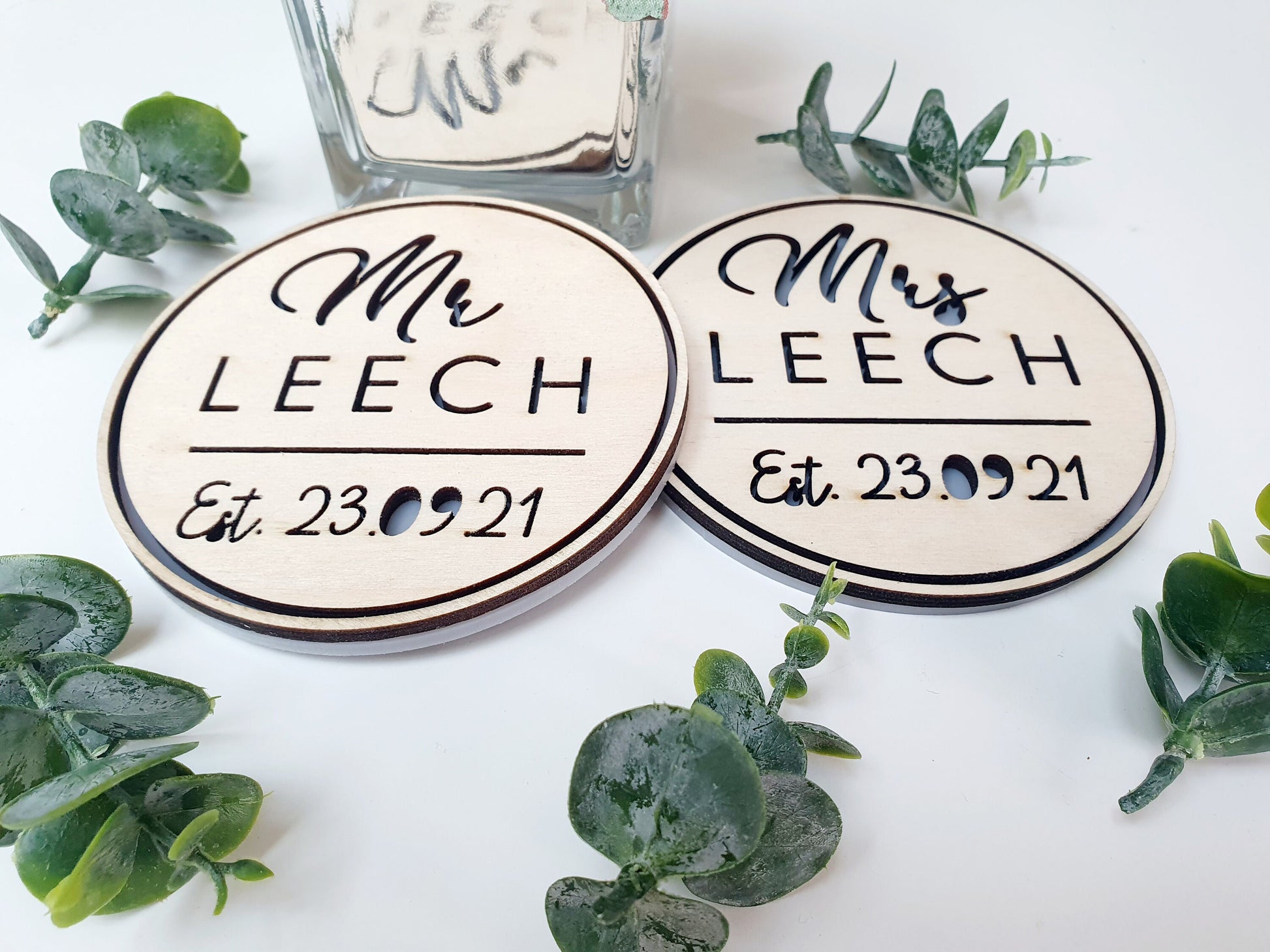 Mr and Mrs Personalised Wooden Coasters - Small Wedding Gift - Small Present for Wedding - Rustic Wedding Coasters
