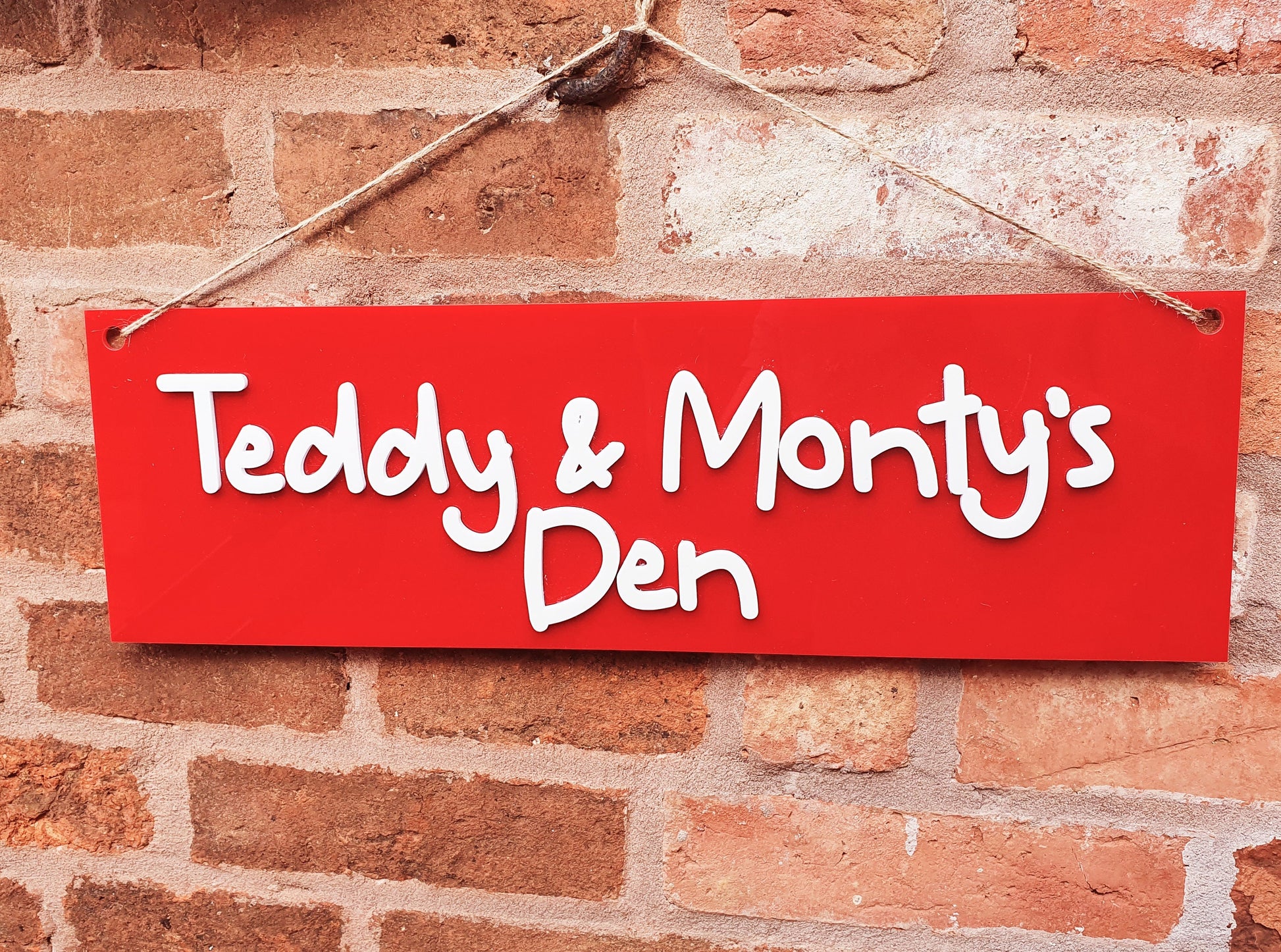 This outdoor children's sign will look amazing in your garden. The kids outdoor wall sign is made out of a quality acrylic at 4mm thick. Because of the material it's long lasting and suitable in all weather conditions. The sign has a 3D dimension with the letters being raised off the sign. Whether you want a sign for your child/children's mud kitchen, den, playhouse, wendy house or vegetable patch this sign is ideal. The acrylic plaque sign measures 395mm by 140mm and includes two holes to put your sign up. The colours of the kids outdoor sign are red and white but we do a range of colours to pick from and you decide what names you would like on your sign and what you would like it to be called ie - Playhouse.