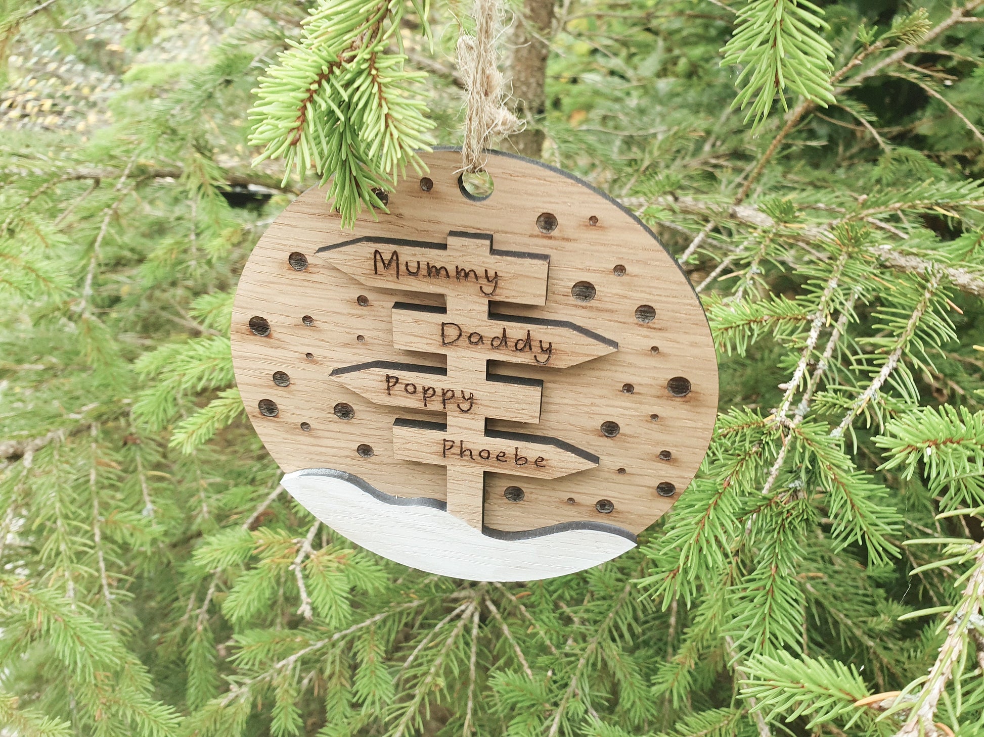 Our personalised Christmas family with name baubles look fabulous on any Christmas tree. A lovely gift to give any family or friend before Christmas to hang on their tree. You can have any names on your Christmas bauble. The bauble is crafted out of oak veneer giving it a rustic feel and includes a snowy white colour for the show background and arrow signs that include each of your names you would like to include.