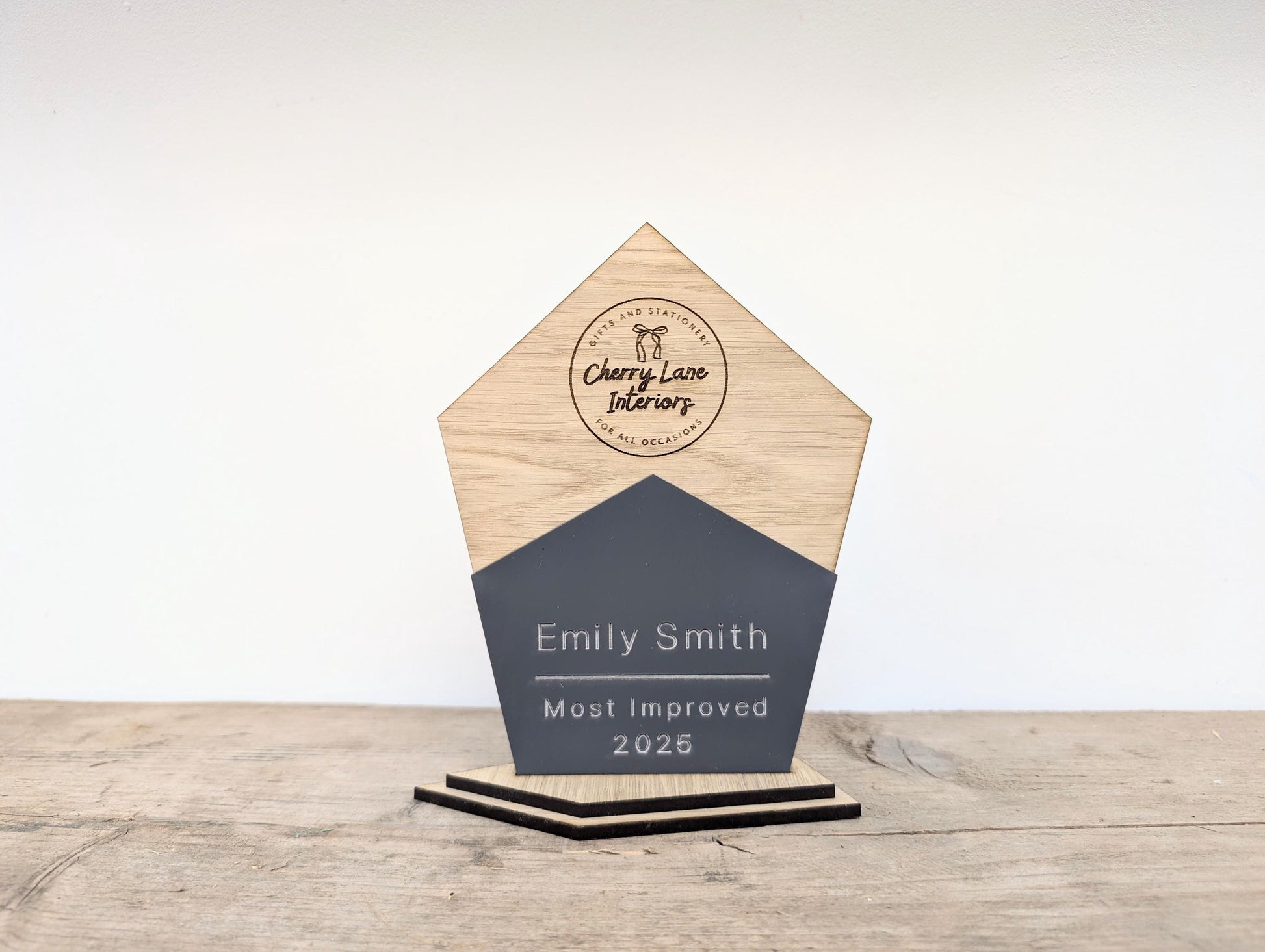 The personalised engraved trophy awards are made from oak veneered wood and matt grey acrylic so they look eye-catching, professional and something a little different.