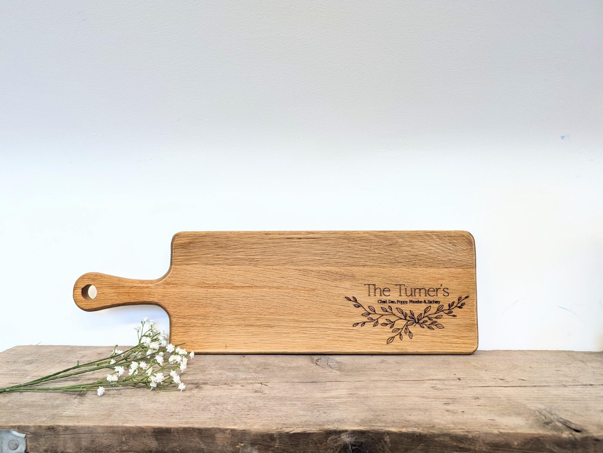 Any text can be included on the wooden paddle kitchen serving board. We have included a family name and all of the names in the family but you could include initials and date for example. A perfect gift for a wedding, anniversary, new home or birthday.