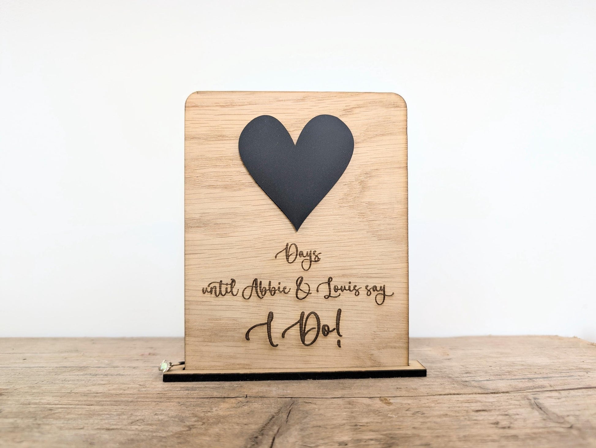 Make the newly engaged couple feel extra special with our beautiful wedding day countdown. Whether they have a long engagement or short, make the countdown super exciting with our countdown oak plaque. The wedding countdown plaque is crafted out of oak veneered wood and includes a base. The countdown includes the newly engaged couples names or Mr and Mrs to Be.