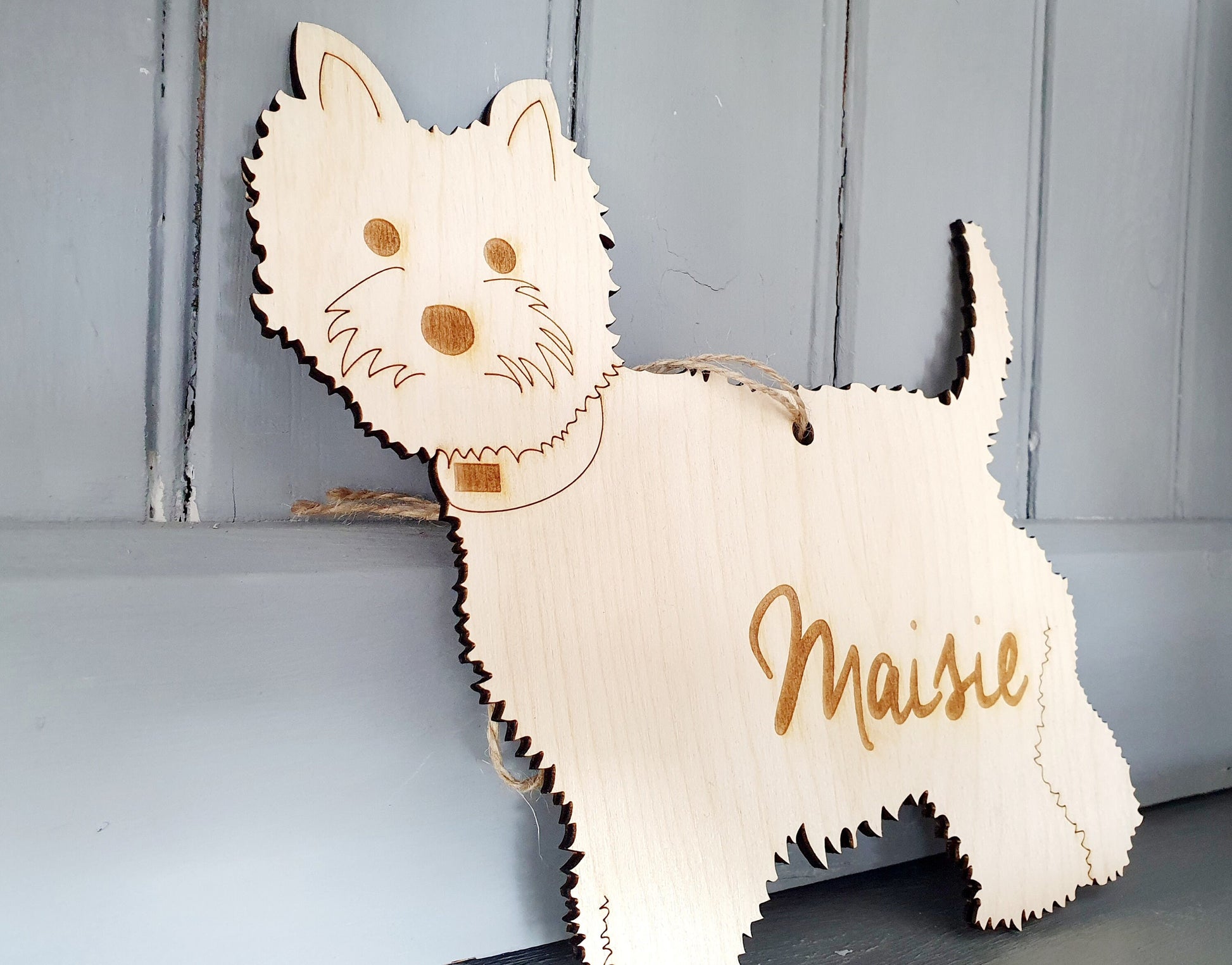 Our personalised Westie wooden dog sign makes a lovely gift for any Westie dog owner or dog for their birthday! The sign comes with a small hole and twine so you can add it to a wall if you like or if you prefer it can be added to a shelf. We think the custom Westie dog breed sign looks lovely above a dog bed or near where the dog normally spends most of it's time. All we need from you is if there any other specific details you would like including say a spot on the dogs face and we will do the rest! The sign is made out of wood and you can include the name of the dog on the sign or the dog owners name or all of them!