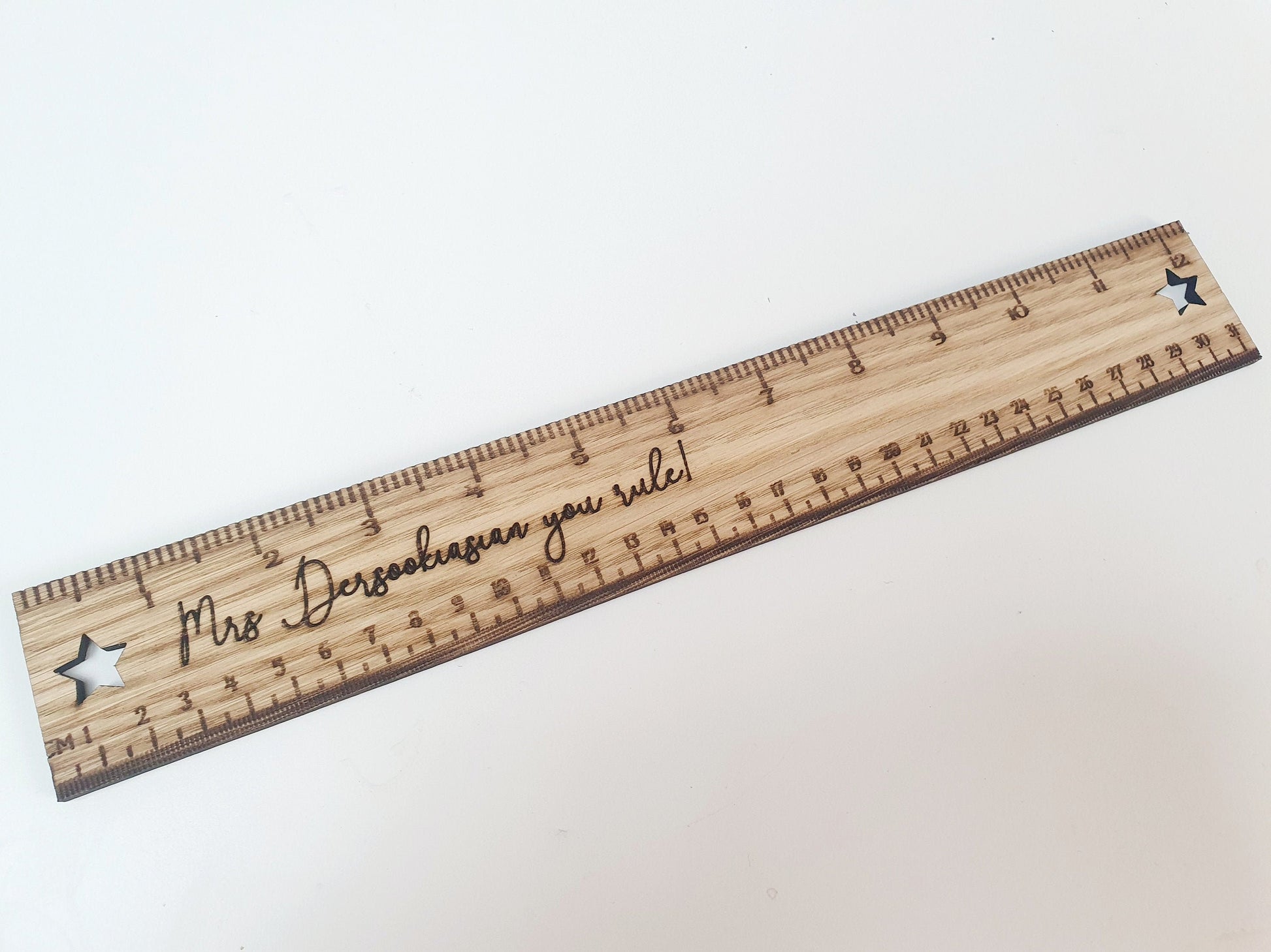 Treat your teacher with our fabulous end of term gift! Does your teacher rule!? If the answer is yes, our fab personalised teacher you rule wooden ruler is the gift for your teacher. This ruler is a fabulous piece of stationery for any school teacher, nursery teacher or childminder! A perfect thank you gift for any school teacher, nursery teacher or childminder! Our beautiful, rustic personalised teacher wooden rulers makes a lovely gift for a teacher of any school year/preschool/nursery. The rulers can also be used as bookmarks and measure 12 inches/30 cms. The rulers have the teacher's name engraved and includes the message 'TEACHERS NAME you rule!' and two stars cut out so you can add ribbon or twine to your ruler for decoration or to hang it somewhere. The measurements are accurate on this ruler and the Ruler is 4mm thick so it's sturdy, long lasting and because its made out of wood its eco-friendly to! A lovely small teacher gift, small childminder gift or nursery teacher gift.