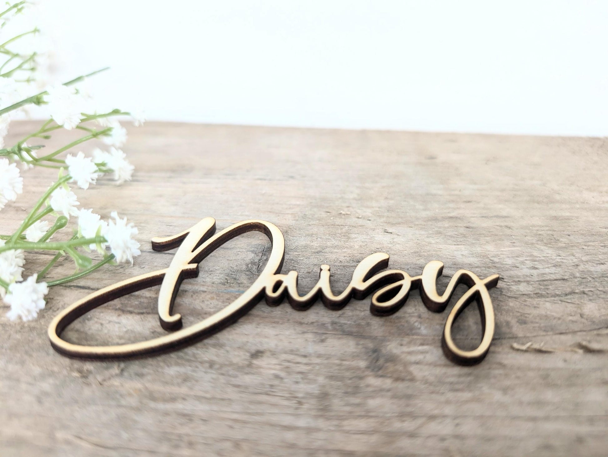 Our modern calligraphy style wooden names come in a range of sizes and colours. The names look fabulous as wedding favours for your guests or at parties or smaller events. The handwritten wooden wedding name places are crafted out of birchwood and are laser cut. The names are 3mm thick and the font used is modern, classy, rustic and most importantly legible!