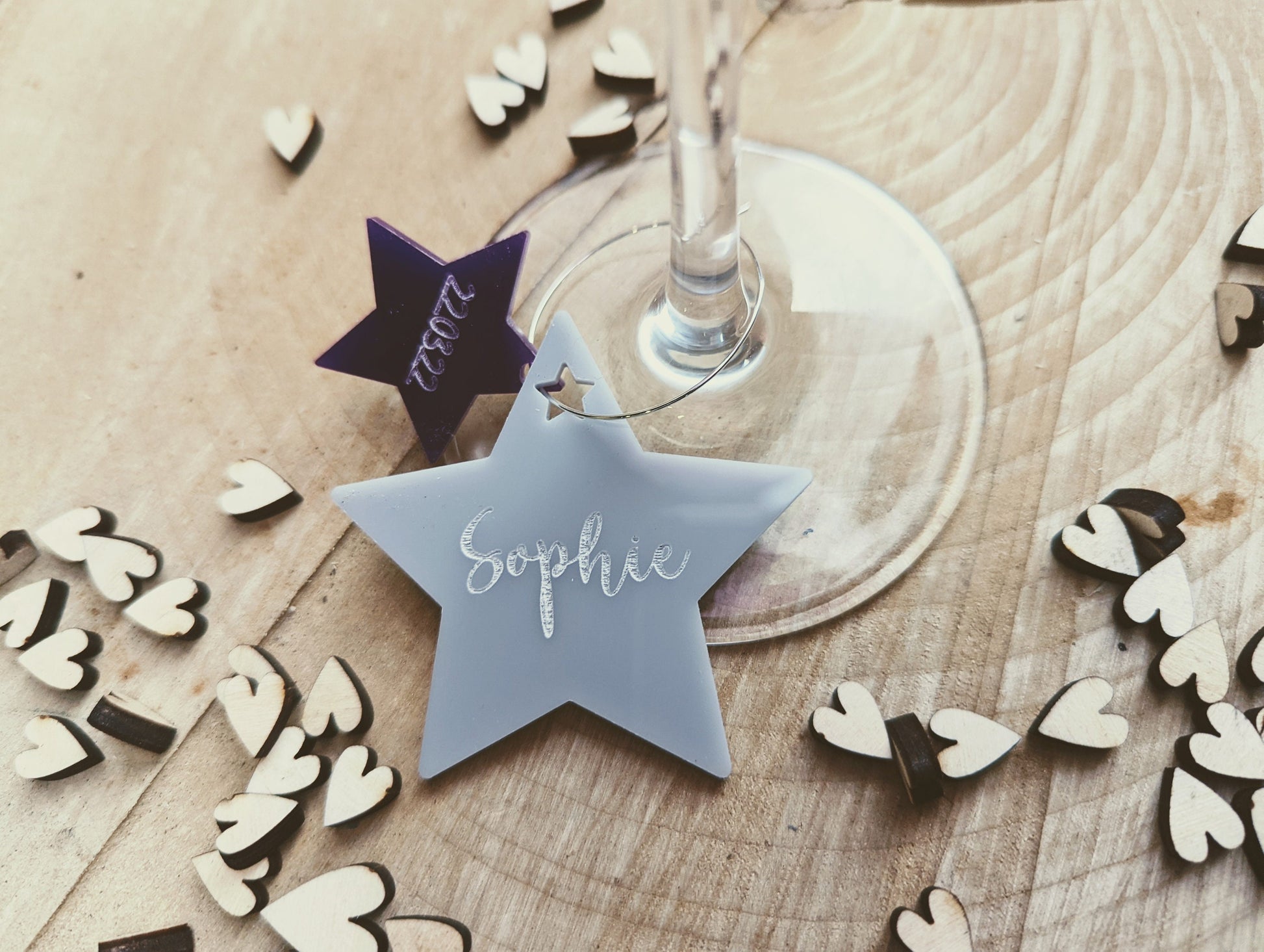 Personalised wine glass star charms - Acrylic wine glass charms available in range of colours - Wine glass charms with name and date