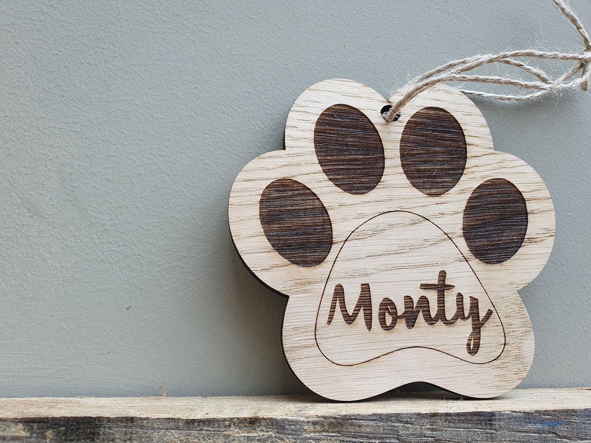 Our personalised wooden dog paw signs makes a lovely gift for any dog owner or dog for Christmas or their birthday or just as a nice gesture! The personalised dog paw print bauble comes with a small hole and twine so you can add it to a Christmas tree, wall if you like or if you prefer it can be added to a shelf. We think the custom doggie paw sign looks lovely above a dog bed or near where the dog normally spends most of it's time. A great dog Christmas gift but also a great dog lover gift all year round! The sign is made out of oak veneered MDF giving it a rustic feel and you can include the name of the dog on the sign or the dog owners name or all of them! The wooden dog paw is best to be kept inside but it can be used outside if you add an all weather lacquer to it. Simply, a lovely dog gift!