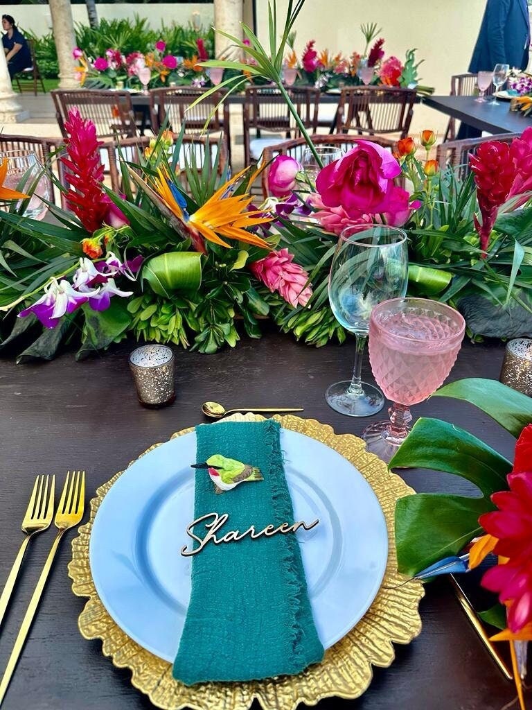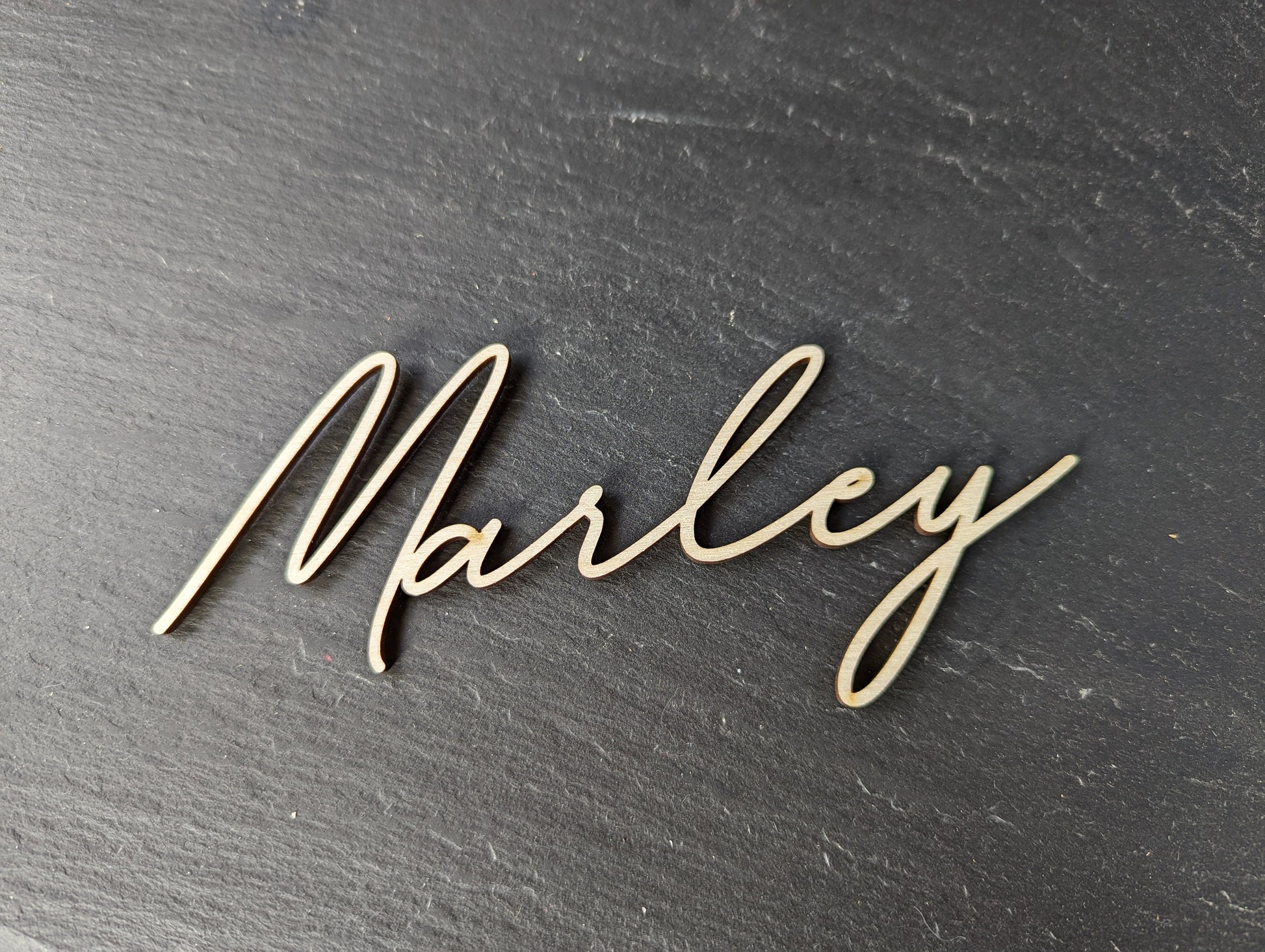 Our calligraphy style wooden names come in a range of colours and have a height of 4cm (from the initial letter). The names look fabulous as wedding favours for your guests or at parties or smaller events. The handwritten wooden wedding name places are crafted out of birchwood and are laser cut. The names are 3mm thick and the font used is modern, classy, rustic and most importantly legible! The wooden names fit perfectly on a napkin or plate as part of a place setting at a wedding, baby showers, Christmas parties and other events.