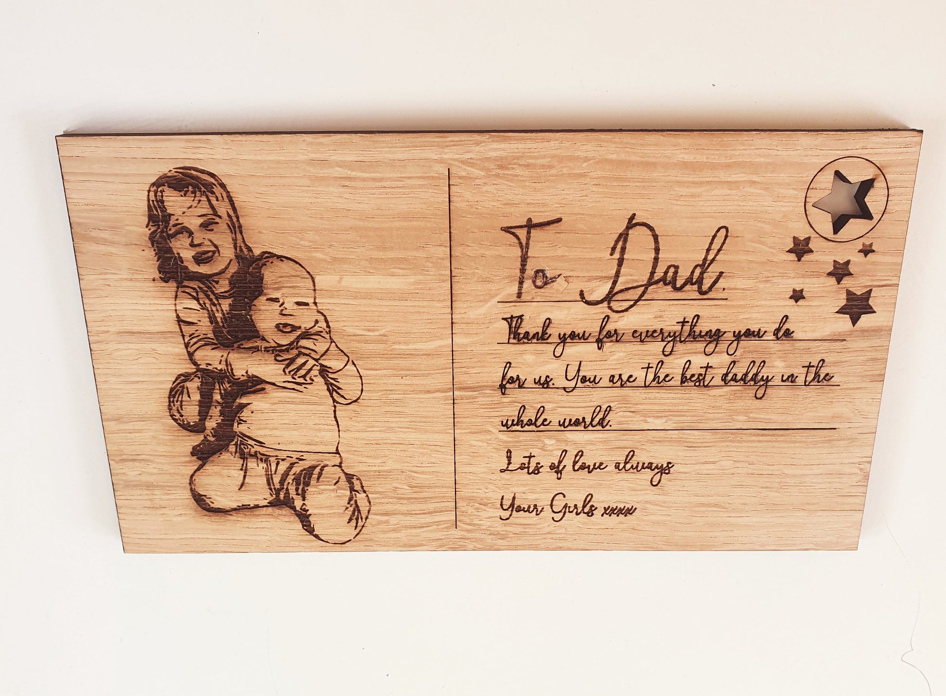 We're really excited to bring to you a fabulous rustic wooden postcard gift that includes an engraved line drawing portrait and custom text/message of your choice. You get to add a name for who the postcard is for, the message and sign the postcard off with the name/s of your choice. The line drawing is based on any photo that you send us. The postcard has a stamp with a cut out star and underlines all the text giving it a real postcard feel. The process is, once you've sent us a photo, we will take the background out of the photo and use our design software to convert your photo into a line drawing. The wooden line drawing postcard makes a lovely gift for any friend or family. It also makes a great gift for any dad or daddy this Father's Day. The line drawing is engraved onto an oak veneered wood and is 20cm wide and 6mm deep.