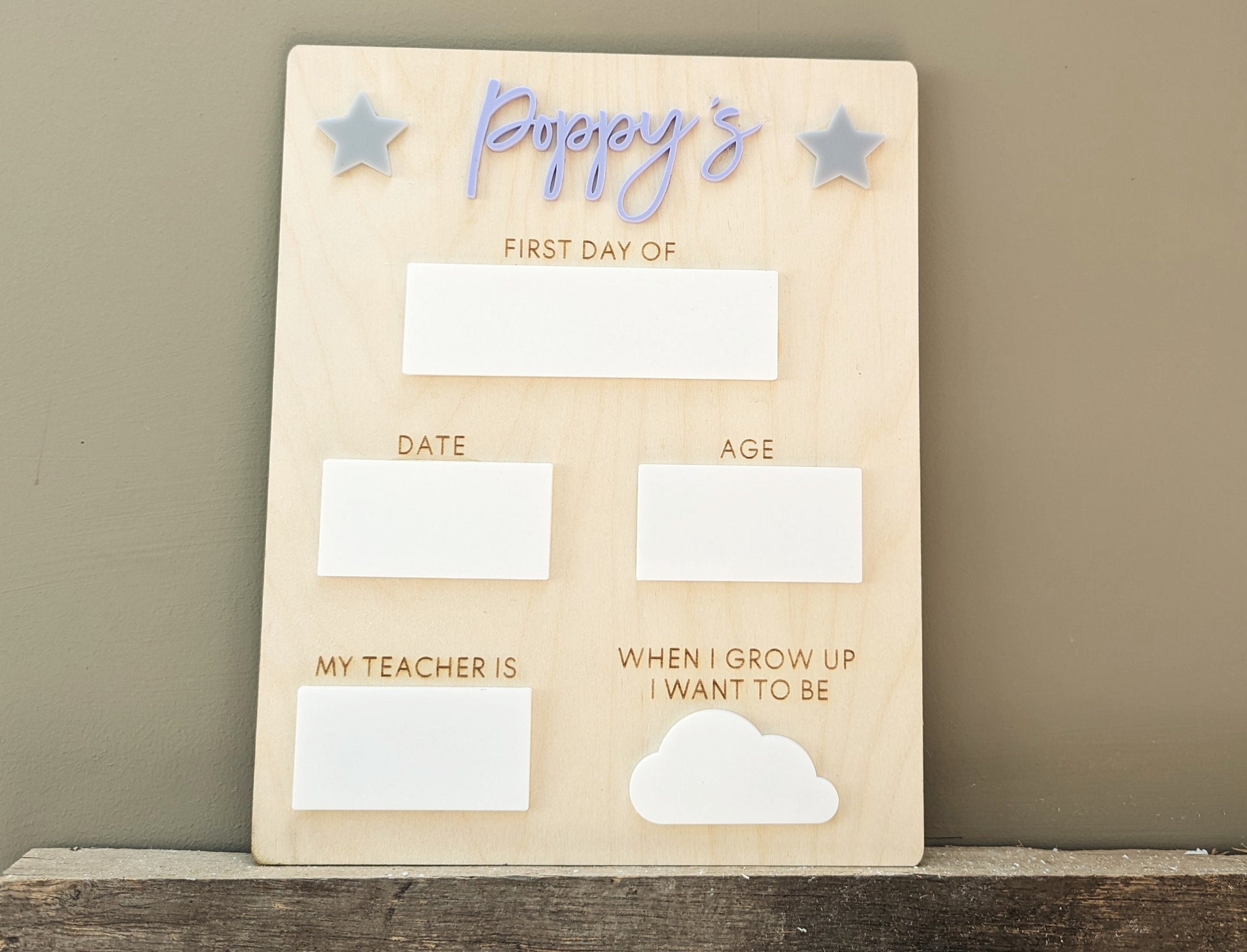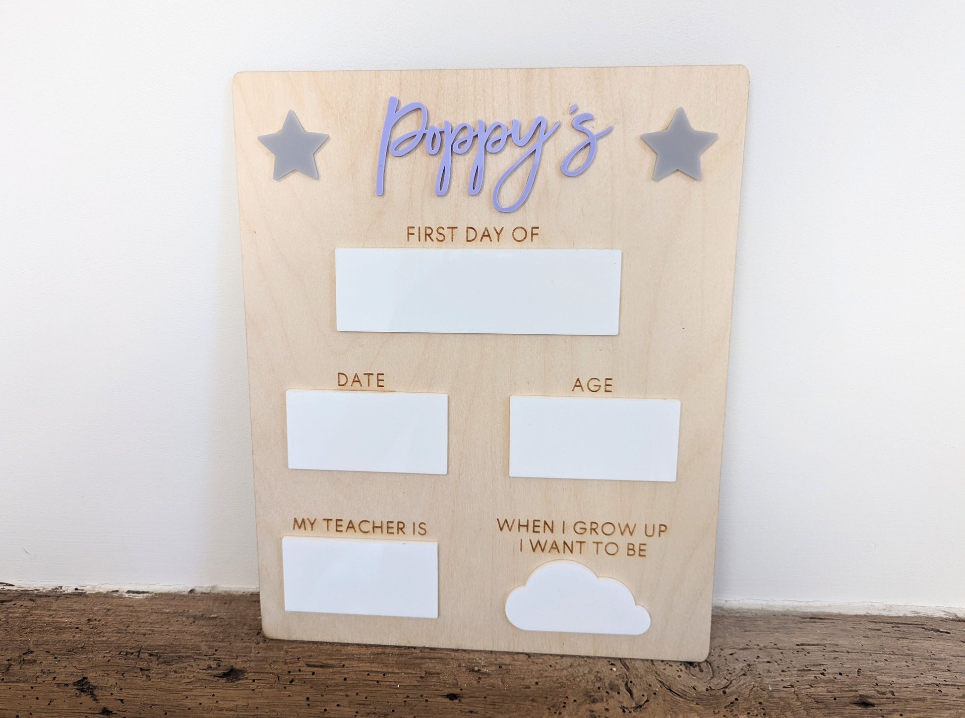 The starting school sign is crafted from birchwood and the whiteboard areas are crafted out of white acrylic making it easy to wipe off when you need. The sign is 18x28cm and you can pick the colours you would like for the name and the stars.