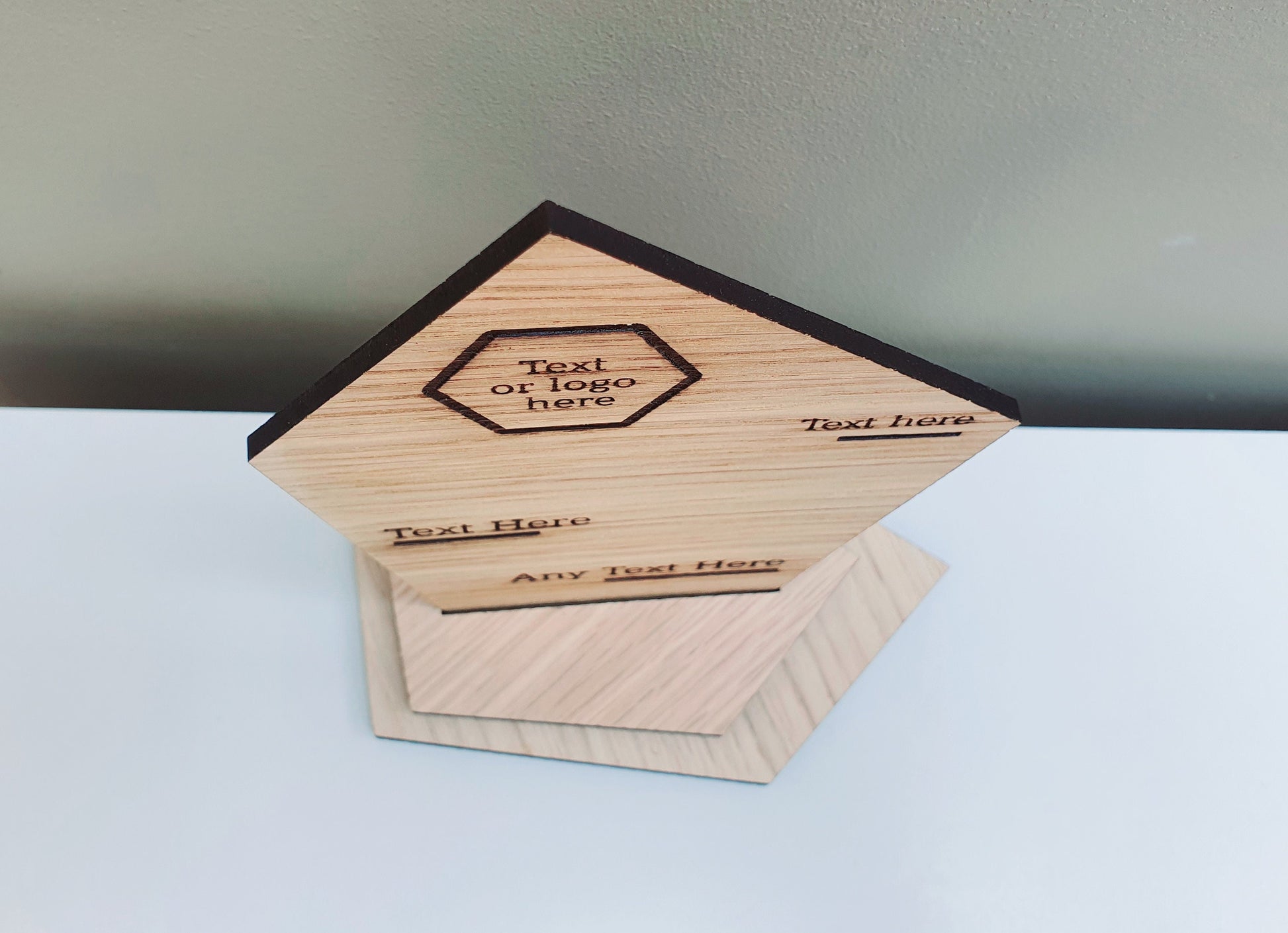 The award trophies with a base are made from oak veneered wood so not only do the award trophies look eye-catching they are also eco-friendly. Whether you are looking for award plaques/trophies for your school, your sports team or your company the design of this award trophy plaque means that it can cater for all. If you have a logo it can be included, the year, the name of the award and who it's been awarded to and the name of the company, team or school. We have the ability to make you as many award trophies as you need and if you need alterations to the design of the award trophy plaque this is no problem to. The award trophies come in a range of sizes so you get to pick the size that suits you. Our unique trophies come with a solid, eye-catching two layered base and have been put together in two geometric shapes. The custom areas on the award trophies are engraved.