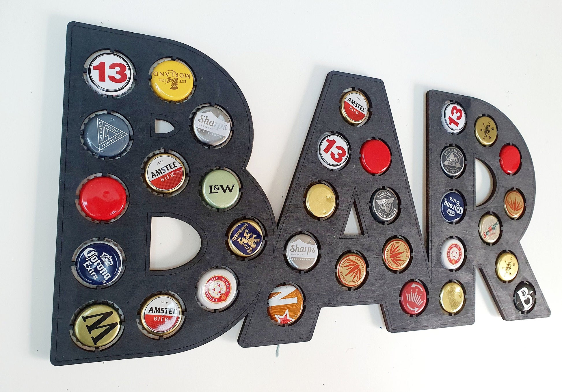A wooden bar sign for a beer lover! A perfect gift for any beer lover who loves different kinds of beer. A rustic wooden bar sign that has the wording 'Bar' with lots of inserts to add your favourite beer bottle caps. The beer bottle tops are simple to add as we've made a 4 point circle insert that's the perfect size for any beer bottle lid. The sign really stands out when you add a range of different beer bottle caps and it gets quote addictive collecting the beer bottle tops! A great novelty gift or gift for any occasion. A perfect gift for any garden bar.