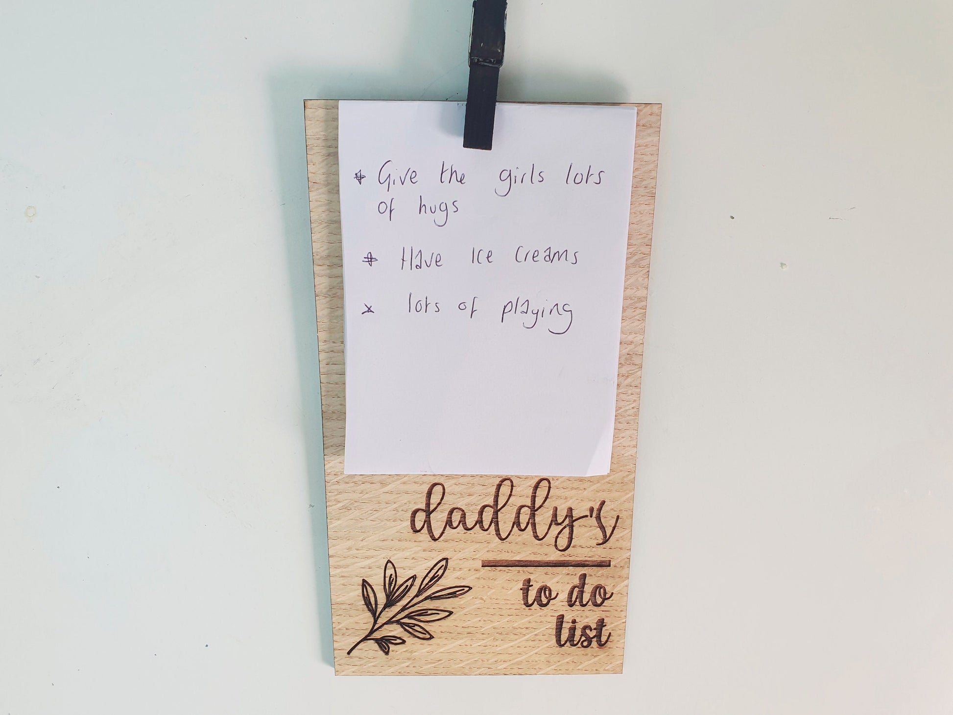 Why not treat your dad this Fathers Day to one of our fabulous wooden to do lists made out of oak veneered wood. The wooden dad to do list has a rustic feel and looks lovely in any home. It's a great gift to give any dad/daddy so they can add things they need to do or you can add to their to do list to. The wooden to do list can include the wording Dad or Daddy and if you would like to include anything else we can add this. To hold the paper on the todo list a peg is attached to the wood which is handpainted a soft black colour.