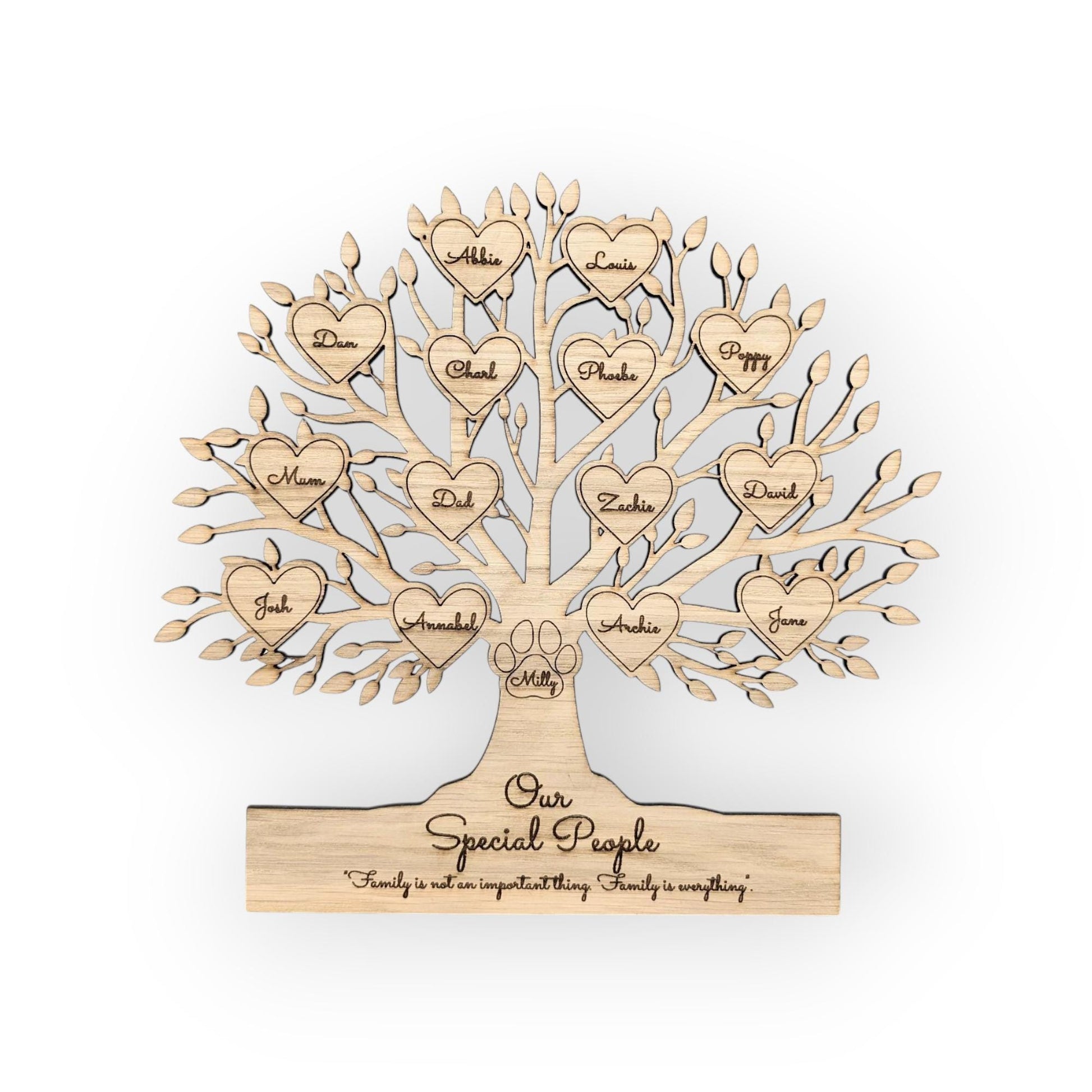 This wooden family tree sign is an absolutely beautiful gift for a birthday, mothers day, fathers day, an anniversary or Christmas. The family tree sign can include any text and up to 20 names. You can also include any pets which will be featured in a pawprint or someone no longer with us in angel wings.