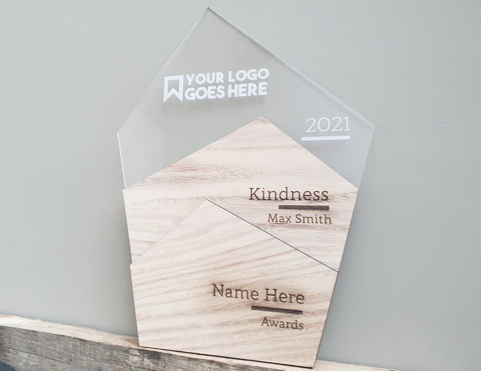 Our rustic freestanding wooden award trophies are a lovely alternative to your standard award plaque, a truly statement piece. They are made from oak veneered wood and clear perspex acylic, making them look eye-catching and something a little different. Whether you are looking for award plaques/trophies for your school, your sports club/team an event you are running or your company the design of this award plaque means that it can cater for all. If you have a logo it can be included, the year, the name of the award and who it's been awarded to and the name of the company, team or school. We have the ability to make you as many awards/trophies as you need and if you need alterations to the design of the award plaque this is no problem to. The awards come in a range of sizes so you get to pick the size that suits you. Our unique trophies are freestanding and have been out together in three geometric shapes. The custom areas on the trophies are engraved.